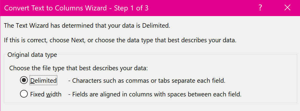 - Delimited, which will break each line into columns based on certain characters. This can be a tab, colon, or whatever character you can think of that will work