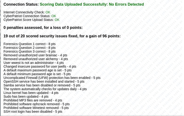Now for my personal view of this competition. As I said before I’ve been coaching my team for the past eight seasons and we’ve managed to do quite well for ourselves given that we are a very small school. Initially, schools struggle with this competition. It’s very resource-heavy with each team requiring three to four reasonably specked machines to run the virtual machines (VMs) and an additional one to run packet tracer. Secondly, the on-ramp for this competition is quite high and, although the AFA does a good job with resources such as learning materials and practice rounds that coaches have the answers to, it’s potential for educational growth to me feels very small. The AFA does produce a “crib sheet” of vulnerability categories at the end of each round, but it is done in such a cryptic manner that teams who are struggling will continue to struggle and unfortunately drop out. All in all, it’s a good beginner competition for those that want to start in Cyber Competitions, but I think its long term appeal is limited due to the small problem space it has to work in.