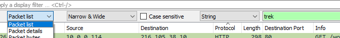 Starting out, we are probably more interested in Packet list to search the Info column and Packet details for the detailed pane.