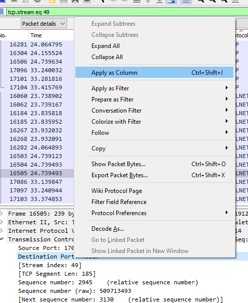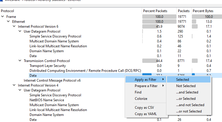 Or all we need to do is go search through the details pane and find one example of what we want, and right click, Apply as Filter → Selected. This will auto-populate the filter bar with the appropriate filter and apply it.