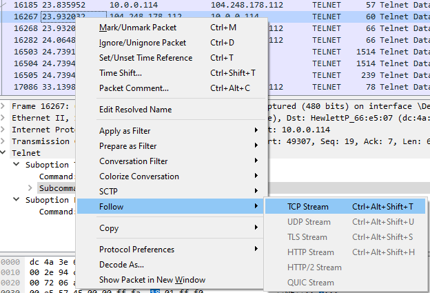 If you find something that looks interesting, right click, follow → TCP stream or right click, follow → HTTP stream and it will show you a pop-up with details of that particular conversation.