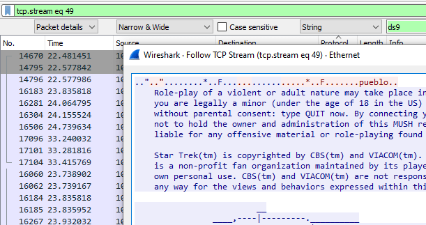 Notice the filter bar has been auto-populated with tcp.stream eq 49. You will have to X that out to go back to an unfiltered spreadsheet. That is also an example of what a filter looks like, but our pop-up now displays the contents of the entire stream conversation. There can be very interesting things to find doing this.