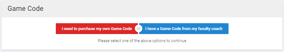 After you register, you will have the option to purchase Game Codes, and you can purchase as many as you need for students. You will receive those Game Codes and will be able to distribute them as you please. Students will then go to the registration page, click on Student Player, select “I have a Game Code from my faculty coach,” as seen above, and enter the Game Code you provided to them.