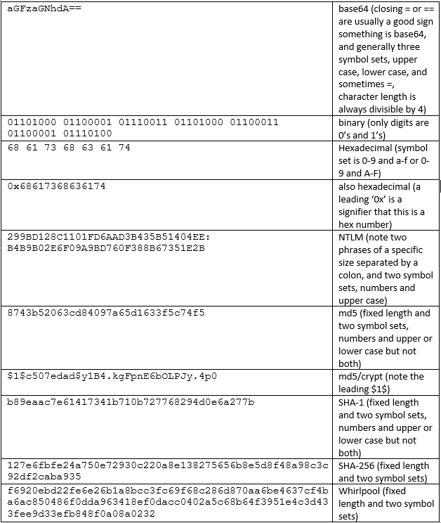 Each hash type is always of a predetermined length, and different ones may use different character sets or leading digits, like how md5/crypt is recognizable by the leading $1$. In time, a lot of these will be recognizable at a glance. Hashcat offers an example guide which is a very handy reference, and there also exist software alternatives that will make a best-guess at what type of hash a certain hash is. This guide is also helpful because once you identify the hash, it tells you what attack method to use in Hashcat. You can search “what type of hash is this” in your browser, and multiple online hash checkers will appear. If you receive a Token length exception, that is a sign that the type of hash you are trying to crack does not match the -m identified hash in Hashcat.