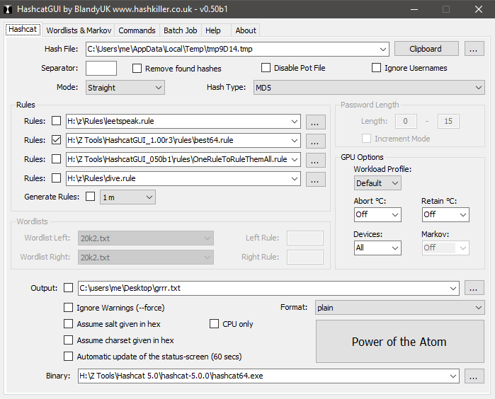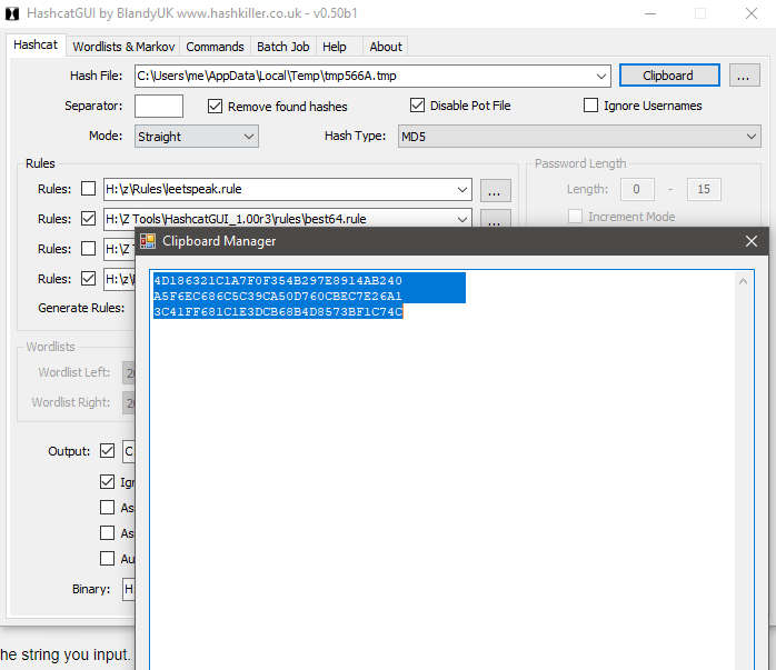 If you use the GUI, one thing to keep in mind is that if you’re going to crack from the clipboard, pay attention to white spacing in the hashes you paste.
